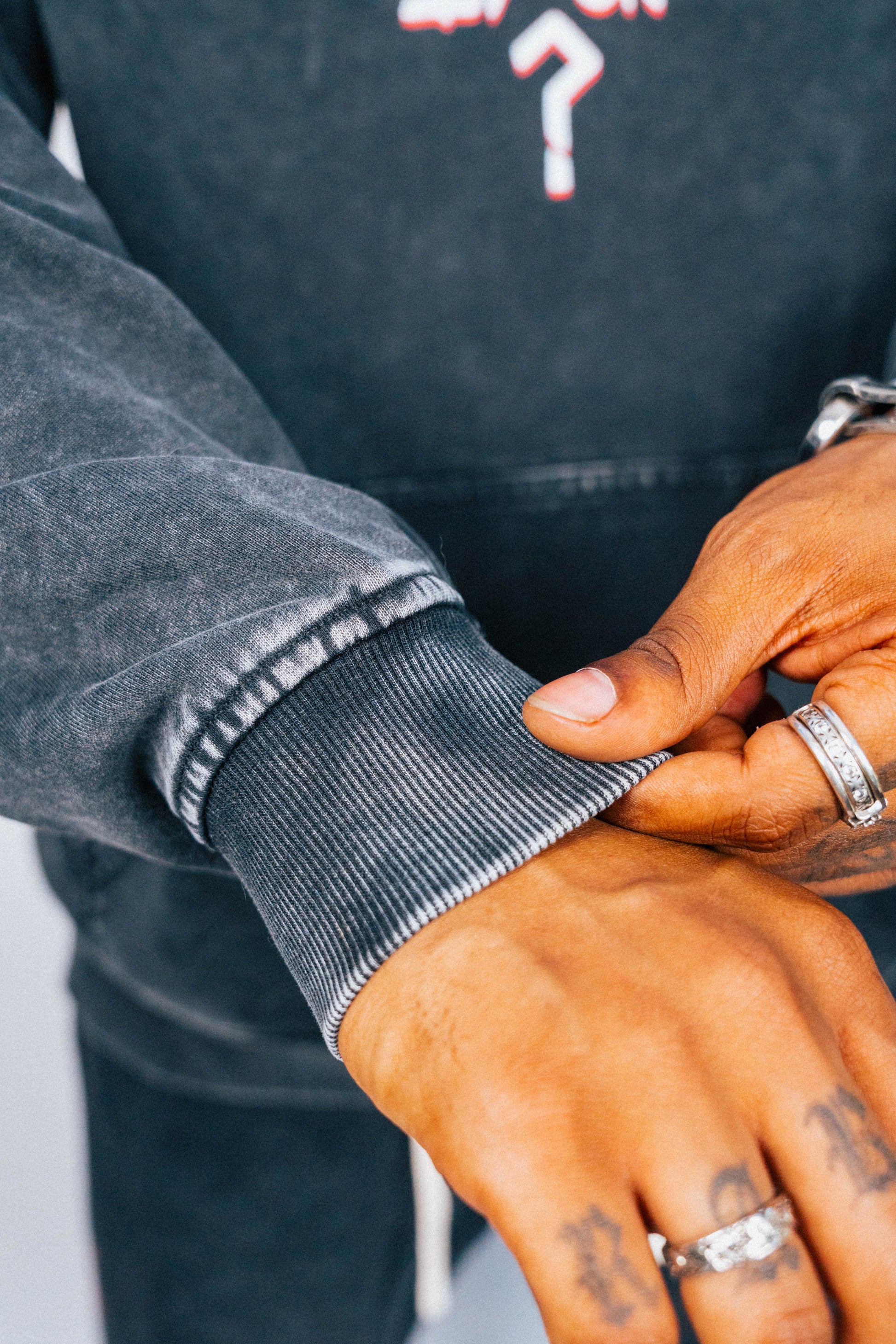 - Double-stitched ribbed cuffs and hem